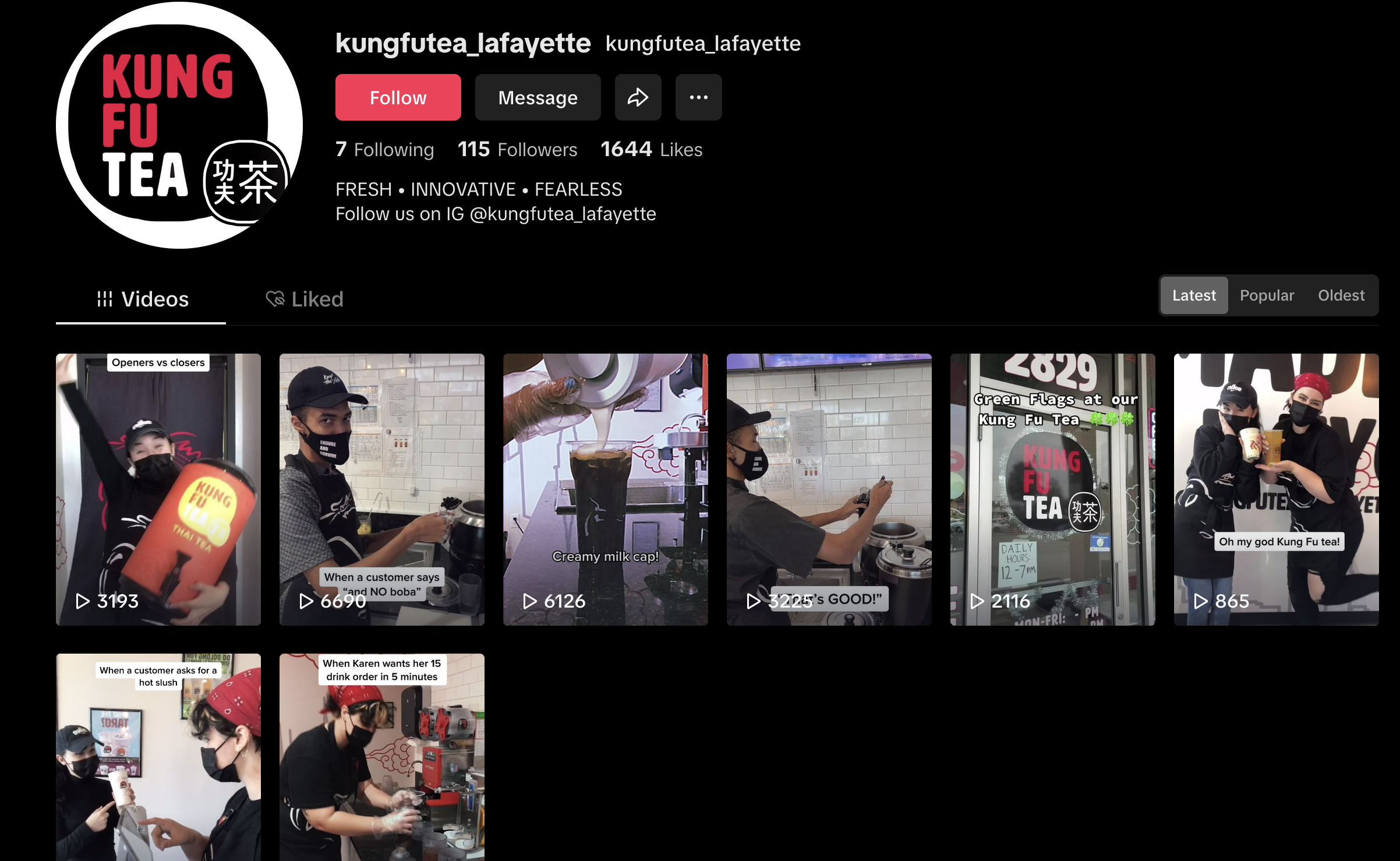 From November 2021 to January 2022, I initiated, managed, and produced video and photo content for Kung Fu Tea Lafayette’s TikTok and social media presence. I directed engaging short-form videos, and captured branded photo content to build local visibility and online engagement. In addition to the local store’s accounts, I also contributed select content to the national Kung Fu Tea social media channels, helping to align the Lafayette location with the brand’s wider digital identity.
